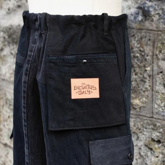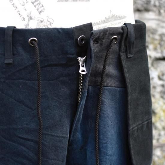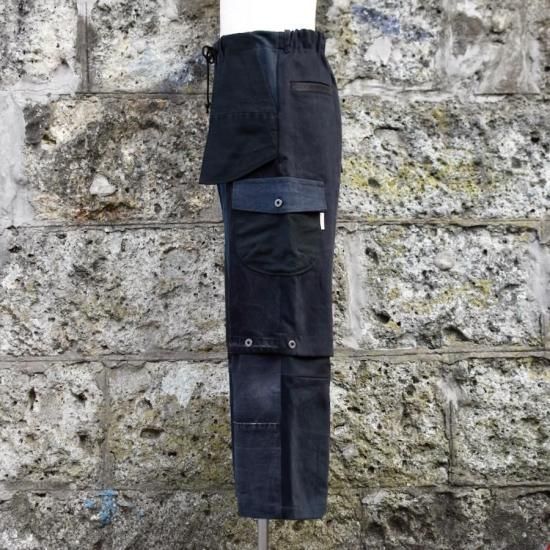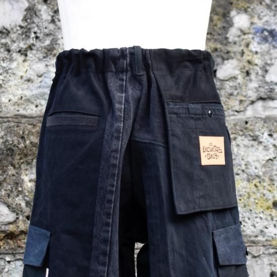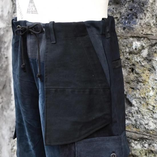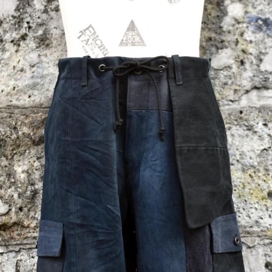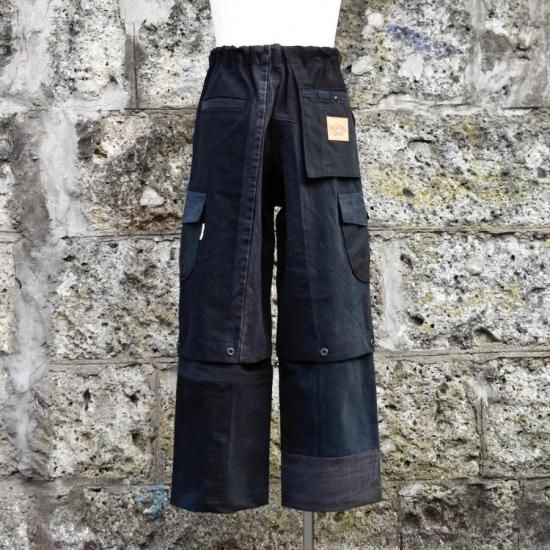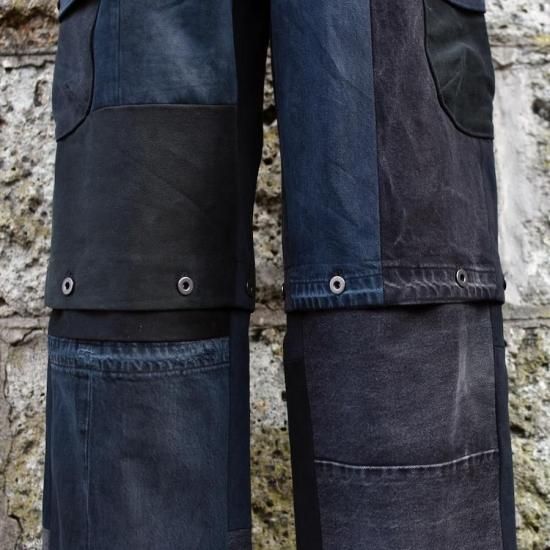 ふんだんに使用し、再構築した1点物のワイドパンツ。